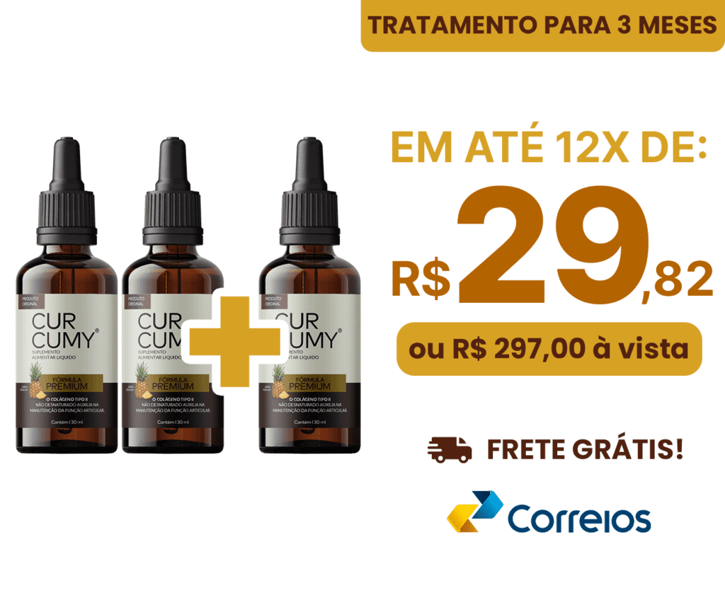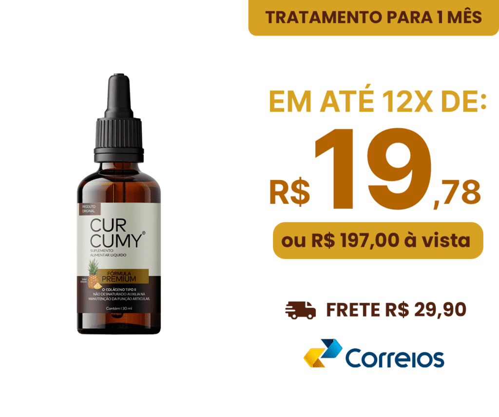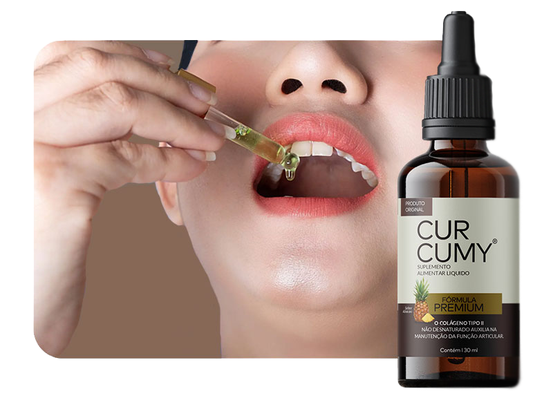 Ingerir 1 ml (20 gotas) do Curcumy por dia (sabor suave de abacaxi), pode ser colocado em alguma bebida de sua preferência, para um alívio prolongado da dor.